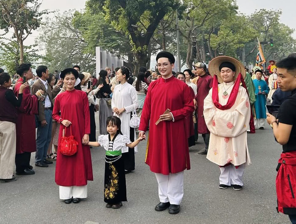 Đoàn rước xuất phát từ Quảng trường Đông Kinh Nghĩa Thục trước khi di chuyển qua phố Hàng Dầu, ngã tư Tràng Tiền - Hàng Khay và vòng quanh hồ Hoàn Kiếm. Lộ trình vốn quen thuộc với người dân Thủ đô bỗng trở thành sân khấu mở khi hàng trăm bước chân nhịp nhàng tiến qua những tuyến phố trung tâm. Dọc đường, người xem liên tục dừng lại ghi hình, trầm trồ trước những bộ lễ phục được phục dựng dựa trên tư liệu triều Nguyễn, từ áo đại triều, hoàng phục đến khăn vấn, hia cưới hay các loại lễ phẩm mang ý nghĩa cát tường. Giữa không gian thoáng đãng của phố đi bộ, đoàn quan viên, gia tộc và hình ảnh tân lang – tân nương bước đi trang trọng tạo cảm giác vừa thiêng liêng vừa gần gũi, như kéo quá khứ trở về trong khoảnh khắc rất đời thường của Hà Nội hôm nay.