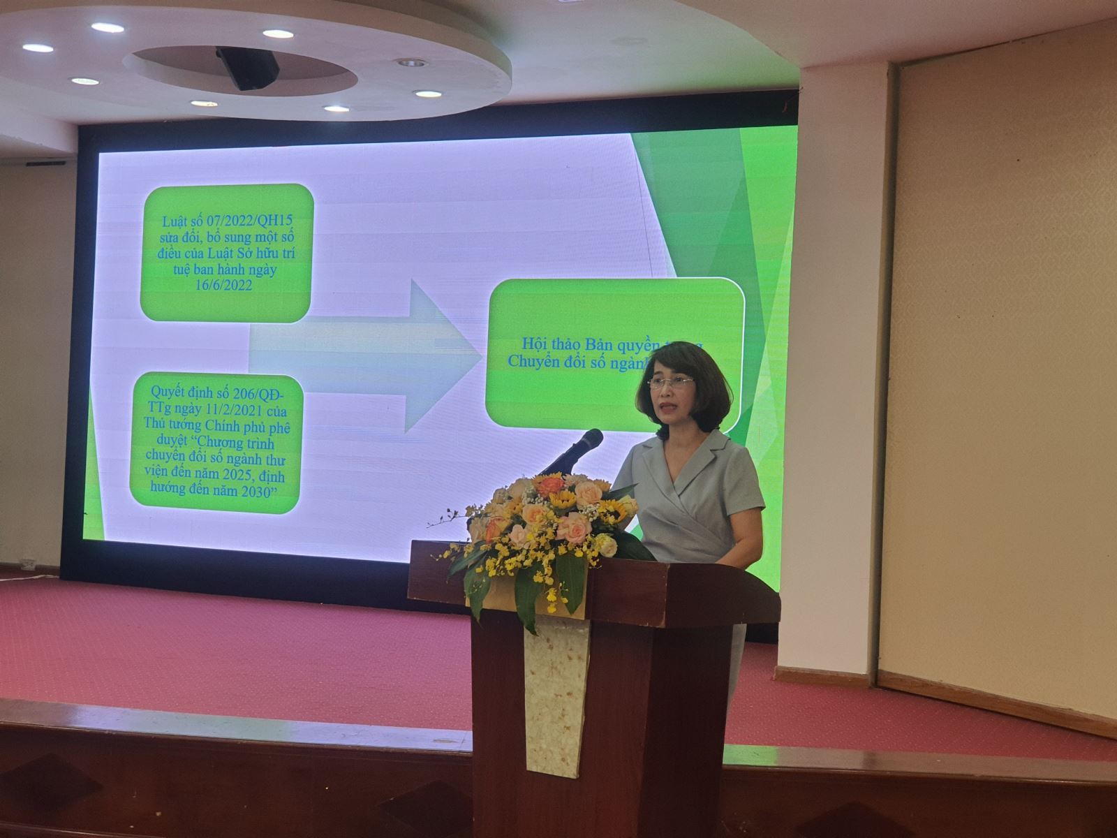 Phát biểu đề dẫn Hội thảo, Vụ trưởng Vụ Thư viện Kiều Thúy Nga cho rằng, việc đánh giá đúng thực trạng thực thi bản quyền tác giả trong hoạt động thư viện nói chung, chuyển đổi số ngành Thư viện nói riêng thời gian qua và nghiên cứu, nắm vững, hiểu rõ nội dung mới của Luật Sở hữu trí tuệ, đặc biệt là quyền tác giả trong hoạt động thư viện là yêu cầu cấp thiết hiện nay. Đây là căn cứ để xây dựng giải pháp phát triển nguồn tài nguyên thông tin đặc biệt - nguồn tài nguyên số và phục vụ người dân góp phần thực hiện các mục tiêu đặt ra trong chương trình chuyển đổi số, tiến tới xây dựng thư viện hiện đại phục vụ người dân.