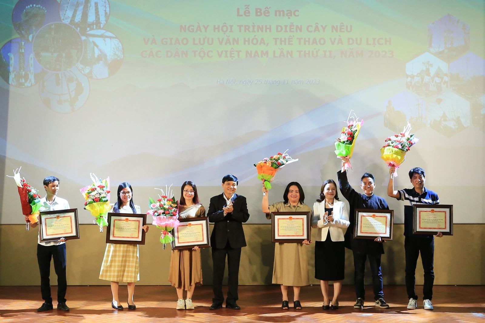 Vụ trưởng Vụ Văn hóa dân tộc Nguyễn Thị Hải Nhung và Phó Trưởng ban Ban quản lý Làng VHDL các dân tộc Việt Nam Phạm Văn Quyến, trao Bằng khen của Bộ trưởng Bộ VHTTDL cho các đoàn tham dự Ngày hội