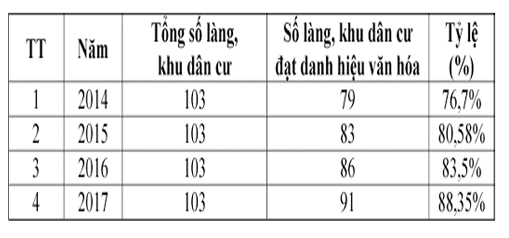 Xây dựng làng, khu dân cư văn hóa: Ban chỉ đạo phong trào “Toàn dân đoàn kết xây dựng đời sống văn hóa” huyện đã chỉ đạo, hướng dẫn các xã, thị trấn trên địa bàn huyện triển khai các tiêu chí cụ thể và sát thực về xây dựng làng, khu dân cư văn hóa. Công tác tuyên truyền, vận động, đăng ký xây dựng danh hiệu và duy trì danh hiệu làng, khu dân cư văn hóa được tổ chức thực hiện công khai, dân chủ. Phong trào xây dựng làng, khu dân cư văn hóa trên địa bàn huyện đạt được kết quả như sau:
