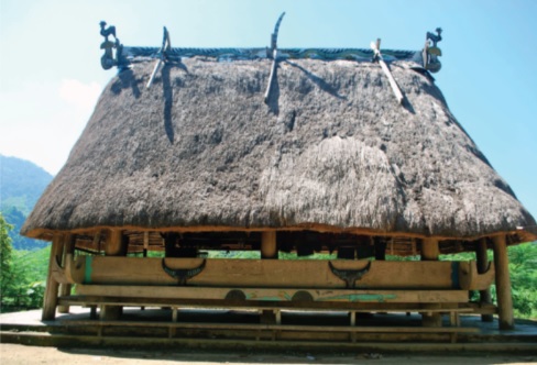 Trên lưng chim Triêng, hình đầu trâu với cặp sừng cong vút hiện ra đầy uy nghi. Con trâu vốn là tài sản quý, là vật hiến tế trong những lễ hội lớn, mang đến sự sung túc, may mắn. Bên trên nữa, hình một chàng trai khỏe mạnh, hai tay giơ cao chống đỡ, nâng đỡ cả mái nhà, trên đầu lại có hai con hổ oai phong. Tất cả tạo nên một bản hòa ca bằng hình khối: chim – trâu – người – hổ, gói ghém khát vọng ấm no, sức mạnh và sự trường tồn.
