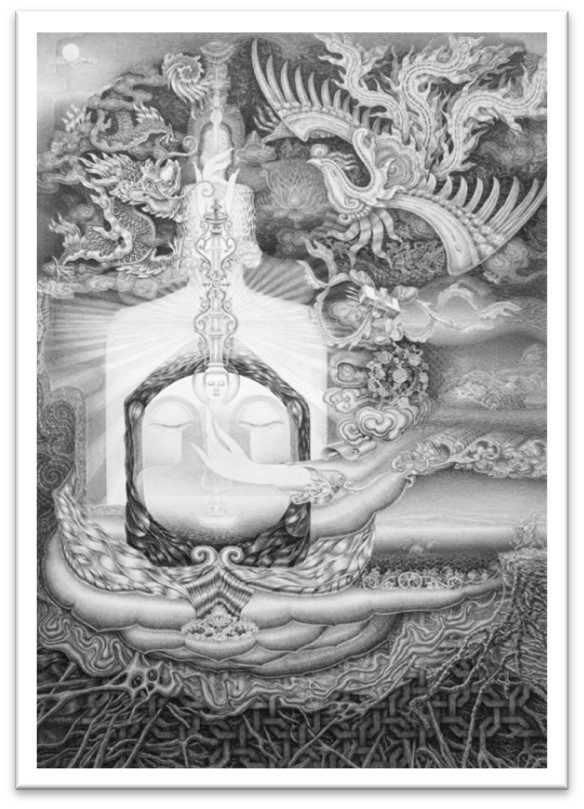 Tác phẩm: "Ngàn năm soi sáng chốn linh thiêng" của Nguyễn Đức Hùng, bút mực trên giấy, kích thước 120x84cm