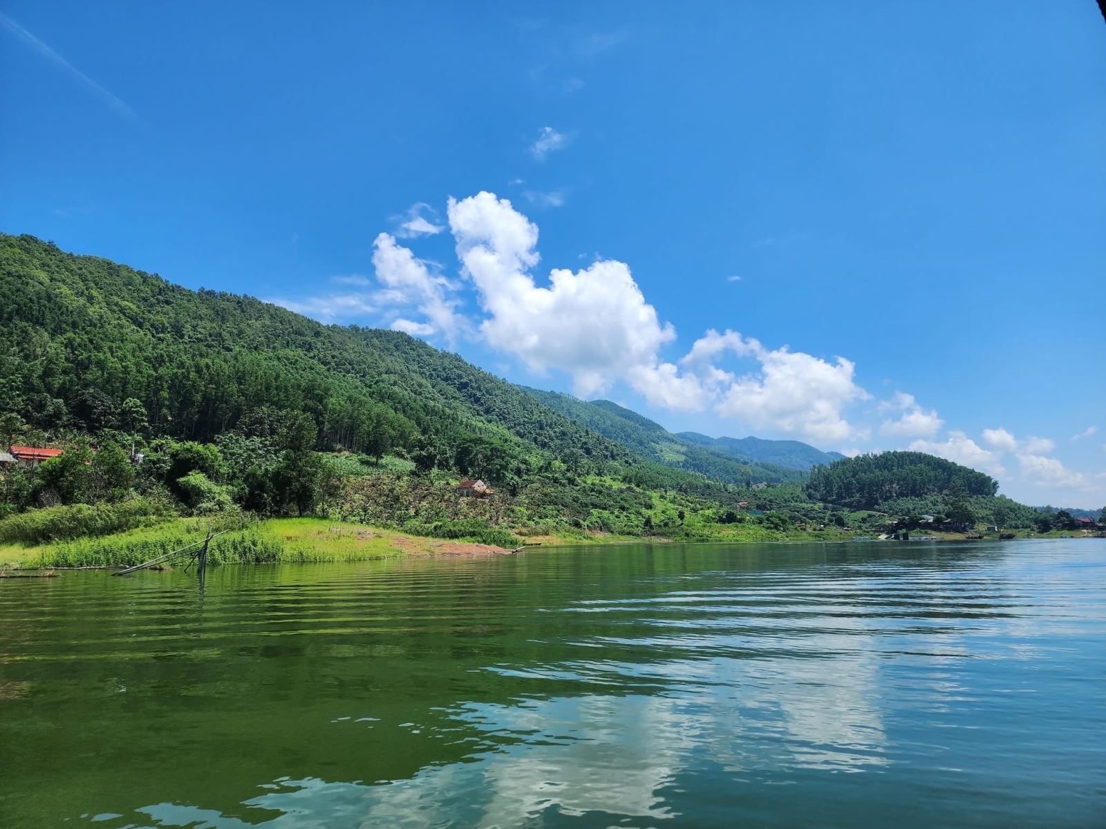 Chúng tôi thuê một chiếc thuyền nhỏ của người dân địa phương để men theo các hòn đảo nổi lên giữa lòng hồ. Thuyền lướt nhẹ, để lại vệt sóng dài loang loáng ánh nắng Thu. Cảnh sắc như tranh vẽ: một bên là núi thoai thoải phủ kín màu xanh rừng, một bên là sóng nước mênh mang. Thi thoảng, vài ngọn núi nhô cao như những chiếc mũ bảo vệ bình yên cho mặt hồ. Gió thổi nhè nhẹ, mang theo mùi ngai ngái của cỏ cây và vị mặn mòi của nước hồ. Tôi bỗng thấy mình nhỏ bé, như đang đi lạc vào một miền cổ tích.