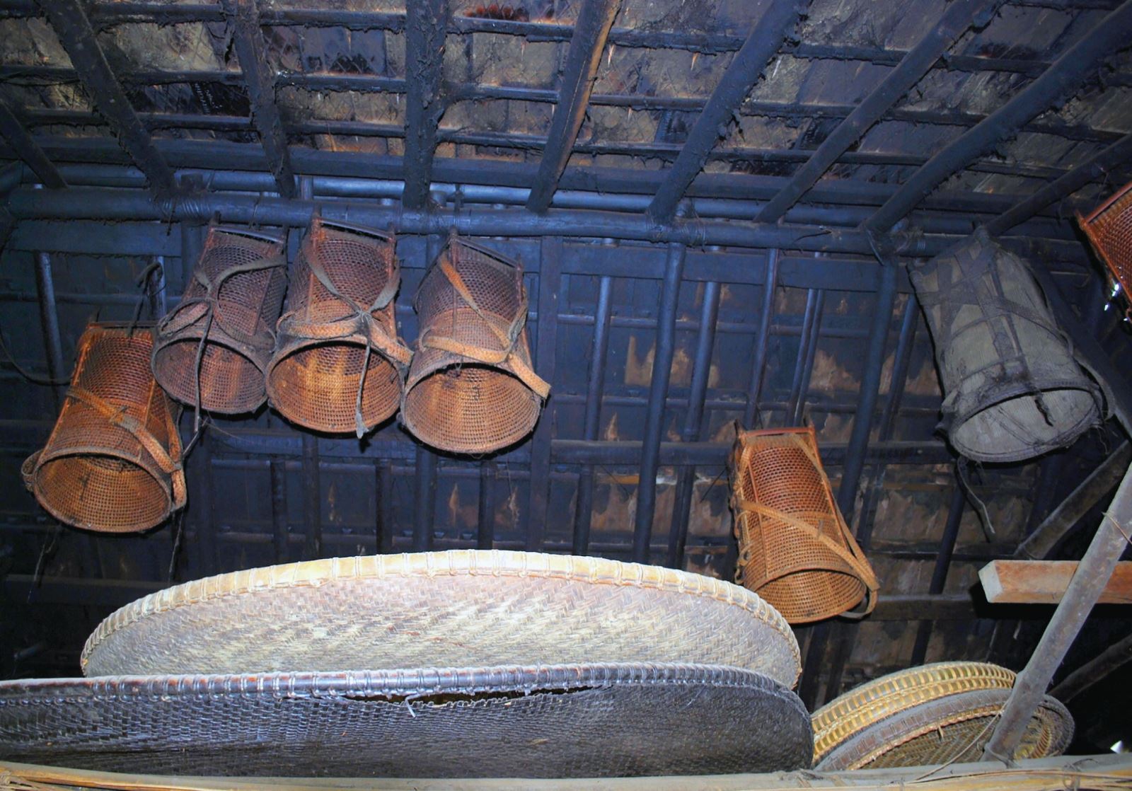 Các dụng cụ đan lát bằng mây tre hong trên gác bếp