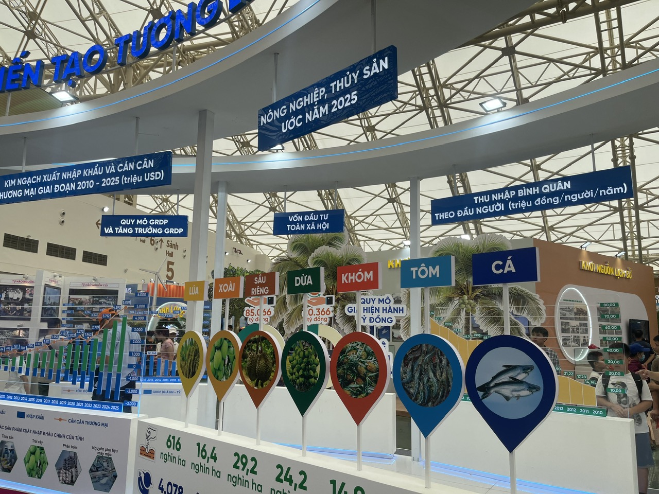 Khu vực Triển lãm của Đồng Tháp được chia thành 4 không gian chính. Trong đó, khu vực phía bên phải từ cổng chào được bố trí các biểu đồ, bản đồ, mô hình hộp đèn LED minh họa trực quan với những chỉ số nổi bật về quy mô GRDP, kim ngạch xuất khẩu và cán cân thương mại, nông nghiệp thủy sản... Cùng với đó là ba trụ ảnh lớn khắc họa hành trình 80 năm xây dựng và phát triển của tỉnh trên các lĩnh vực chính trị, kinh tế, văn hóa, xã hội, an ninh – quốc phòng.