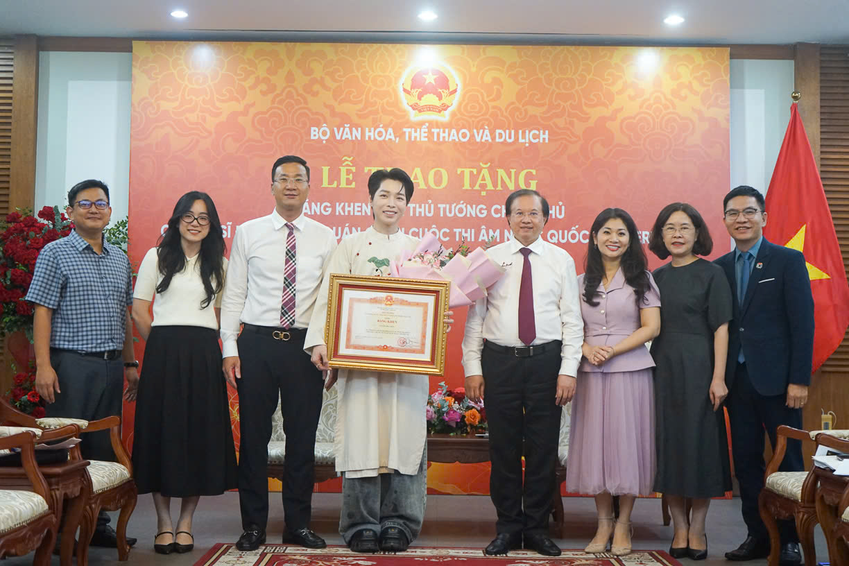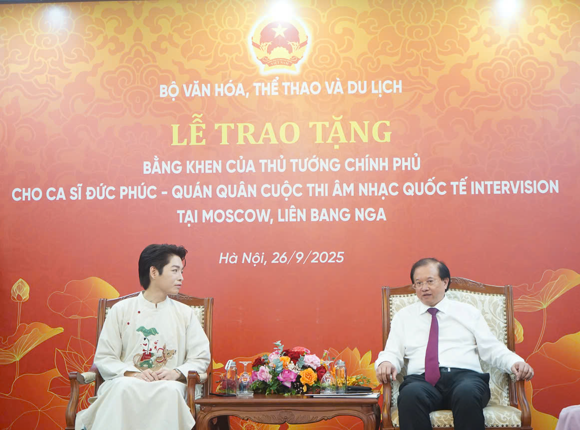 Chiều 26-9, tại trụ sở Bộ VHTTDL, Bộ VHTTDL đã tổ chức lễ trao Bằng khen của Thủ tướng Chính phủ cho ca sĩ Đức Phúc - Quán quân Cuộc thi Âm nhạc quốc tế Intervision 2025 tại Moscow, Liên bang Nga. Thứ trưởng Bộ VHTTDL Tạ Quang Đông chủ trì buổi lễ.