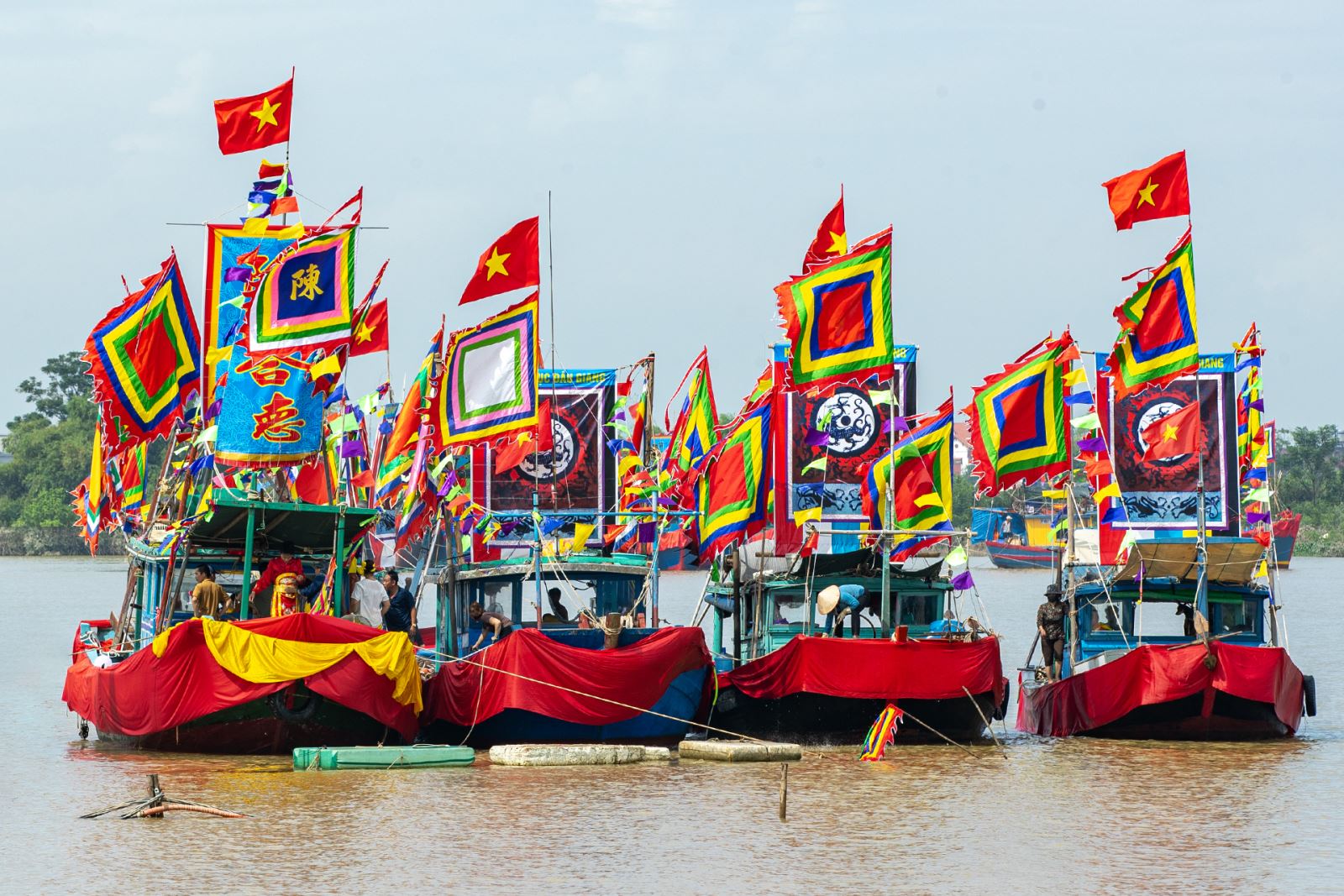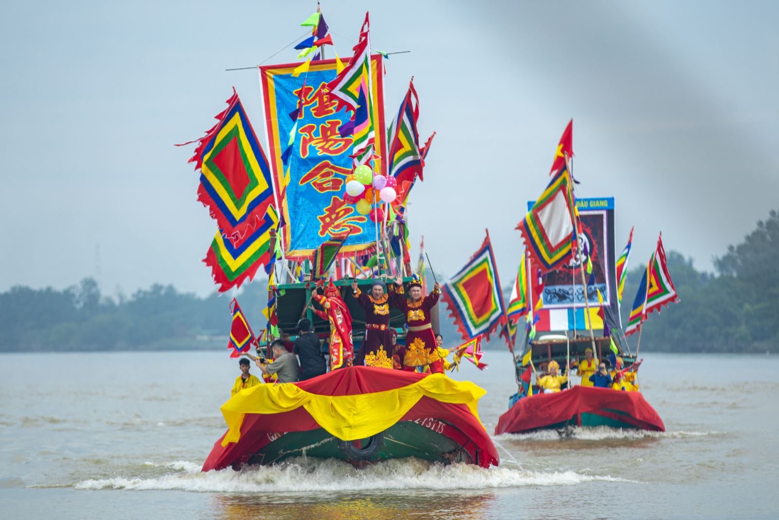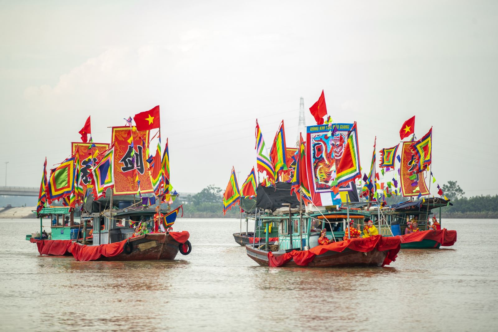 Dưới sông, hàng chục chiếc thuyền được chia thành 2 đoàn. Mỗi thuyền được trang trí bằng những dải vải đỏ lượn sóng 2 bên mạn. Trên thuyền có bố trí những người dân được hóa trang thành các thủy binh nhà Trần. Đoàn thứ nhất xuất phát từ vị trí Cồn Kiếm, phía đền Nam Tào. Đoàn thứ hai tập kết bên sông trước đền Bắc Đẩu, các thuyền khác mang biển Thanh Long, Bạch Hổ và những thuyền sau mang biển chữ, câu đối, sẵn sàng đợi lệnh hội quân.