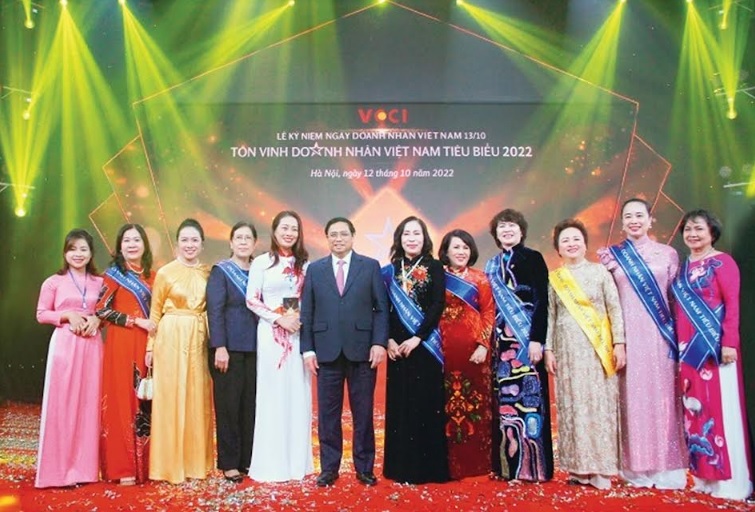 Thủ tướng Chính phủ Phạm Minh Chính chụp hình lưu niệm với các nữ doanh nhân (trong đó có CEO Nguyễn Thị Bích Huệ - người thứ tư từ phải sang) tại lễ tôn vinh doanh nhân Việt Nam tiêu biểu năm 2022