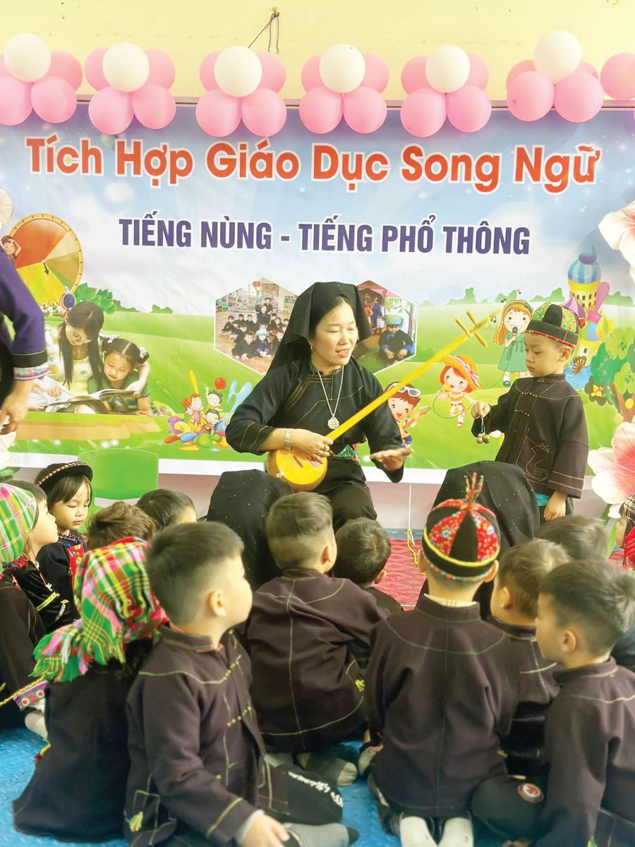 Từ khi nhận công tác tại trường, phần lớn học sinh trong lớp cô là con em dân tộc thiểu số, (đồng bào người Nùng, chiếm 70% dân số) nhưng đa số các em không biết nghe, không biết nói, thậm chí có một số phụ huynh trẻ cũng” bất khả tri: tiếng dân tộc Nùng. Thế là cô bản thân luôn nghĩ phải làm một cái gì đó để góp phần củng cố, gìn giữ tiếng nói mẹ đẻ. Về chuyên môn,bậc giáo dục mầm non chưa có văn bản hướng dẫn dạy lồng ghép song ngữ, chưa có mục tiêu, tiền lệ nào cụ thể để tuyên truyền có hiệu quả tới phụ huynh. Song cô nghĩ là làm, bởi học sinh lớp mầm non học và ăn nghỉ tại trường. Cô thường xuyên nói tiếng Nùng với trẻ, ngày nào cũng như ngày nào, đến hết năm học, trẻ cũng biết giao tiếp một số câu cơ bản. Tuy nhiên, cô cũng gặp những khó khăn, một số phụ huynh mang tư tưởng “Không biết tiếng phổ thông mới sợ, chứ tiếng dân tộc không biết thì chả làm sao”. Vậy là cô đề nghị cho họp phụ huynh để làm công tác tuyên truyền những nghị quyết Trung ương về “Xây dựng và phát triển nền văn hóa Việt Nam tiên tiến đậm đà bản sắc dân tộc” và “Xây dựng và phát triển văn hóa, con người Việt Nam gắn với việc phát triển bền vững của đất nước”… Mưa dầm thấm lâu, Cô chuyển hóa được nhận thức của chính các phụ huynh. Cánh diều bảo tồn văn hóa dân tộc của cô gặp được thêm luồng gió mới từ năm học 2021-2022, Sở Giáo dục có văn bản về việc “Tăng cường giáo dục song ngữ cho trẻ mầm non và tiểu học trên cơ sở tiếng mẹ đẻ” Cô được nhà trường cử tham gia các lớp tập huấn do ngành Giáo dục tổ chức, được nhà trường phân công phụ trách lớp có nhiều con em dân tộc, lấy đó làm mục tiêu đặt ra cho kế hoạch giáo dục. Cô tăng cường tuyên truyền tới các bậc phụ huynh trên các nền tảng facebook, zalo, họp phụ huynh để thống nhất cách dạy trẻ, được phụ huynh và cộng đồng hưởng ứng. Từ đó, các bậc phụ huynh tự nguyện mang những phụ kiện, trang phục như mũ, áo, yếm, vải thêu của dân tộc tới tặng lớp để trang trí góc văn hóa dân tộc. Trẻ đến lớp chào cô, chào bố mẹ, chào bạn, mời cô, các bạn ăn cơm... bằng tiếng dân tộc Nùng. Các hoạt động tại lớp được lên kế hoạch rõ ràng và tích hợp một cách nhẹ nhàng. Cô còn phối hợp với phụ huynh dịch một số bài thơ, bài hát bằng tiếng Nùng để dạy trên lớp và học khi ở nhà. Kết quả, cuối năm học 2024 và 2025 học sinh của cô đã biết nói, biết nghe và giao tiếp bằng tiếng Nùng. Hiện, cô tham gia và giữ chức Phó Chủ nhiệm CLB hát dân ca Nùng của xã, thường xuyên giao lưu và đưa các cháu tham gia Ngày hội văn hóa các dân tộc,các hội thi, hội diễn nghệ thuật quần chúng giành nhiều giải thưởng, được nhà trường và các phụ huynh tin tưởng. Đặc biệt, trong kỳ thi Giáo viên dạy giỏi 2023 – 2025 cô mạnh dạn đưa sáng kiến: “Bảo tồn văn hóa dân tộc Nùng trên cơ sở tiếng mẹ đẻ tại lớp 4TB3” được đánh giá cao.