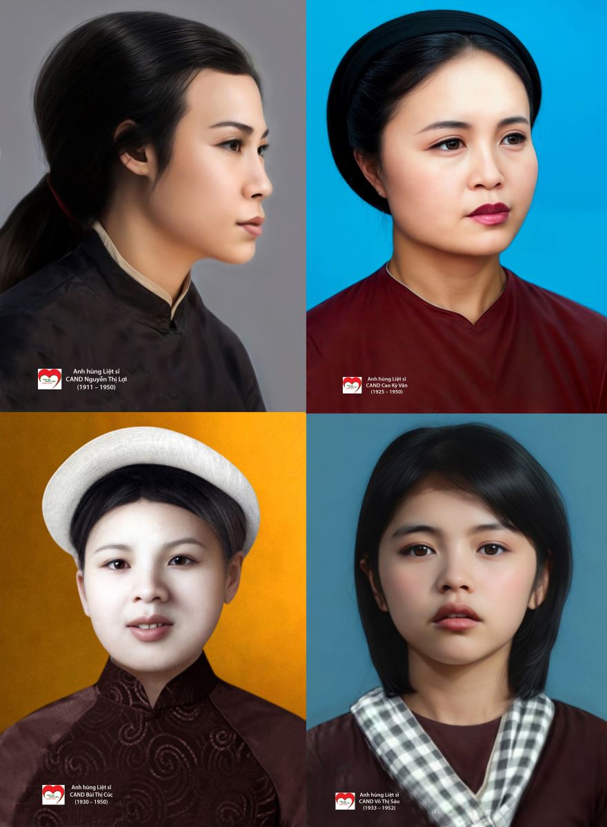 Chân dung 4 nữ Anh hùng Liệt sĩ lực lượng Công an nhân dân (CAND) được trao tặng gồm: Nguyễn Thị Lợi (1911-1950), tên thật là Trần Thị Lời, được truy tặng danh hiệu Anh hùng năm 1995; Cao Kỳ Vân (1925-1950), tên thật là Nguyễn Thị Được, được truy tặng danh hiệu Anh hùng năm 1998; Bùi Thị Cúc (1930-1950), tên thật là Trần Thị Lan, được truy tặng danh hiệu Anh hùng năm 1995; chị Võ Thị Sáu (1933-1952), tên thật là Nguyễn Thị Sáu, được truy tặng danh hiệu Anh hùng năm 1993.