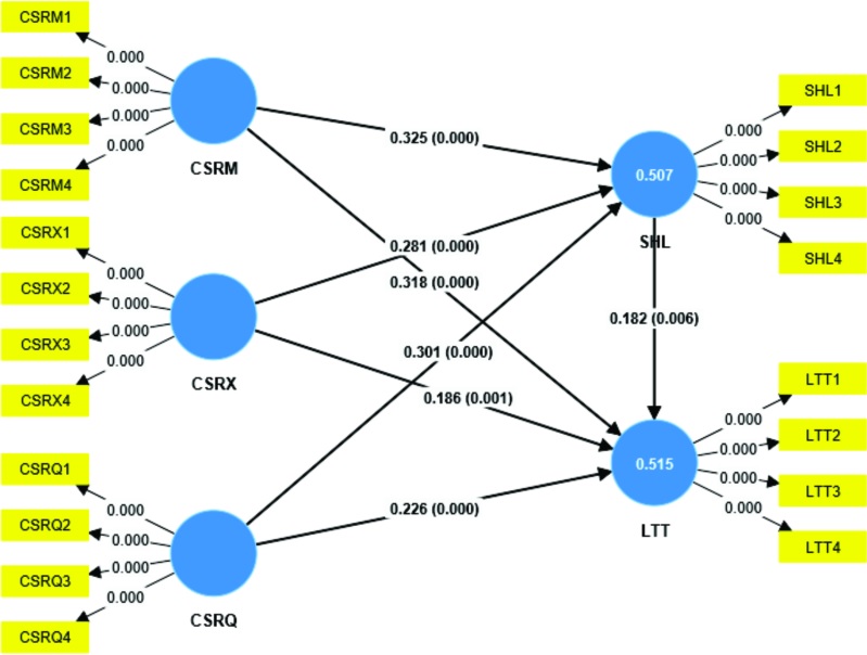 Kết quả kiểm tra hệ số phóng đại phương sai (VIF = 1,322 – 2,057 < 5) cho thấy không có hiện tượng đa cộng tuyến nghiêm trọng trong mô hình, đảm bảo độ ổn định của các ước lượng. Chỉ số R² điều chỉnh đạt 0,507 (sự hài lòng) và 0,515 (lòng trung thành), chứng tỏ mô hình có khả năng giải thích khá cao biến thiên của hai biến phụ thuộc. Đồng thời, giá trị Q² đạt 0,332 và 0,306 (> 0,15) khẳng định năng lực dự báo ở mức chấp nhận được, qua đó củng cố độ tin cậy cho các kết luận nghiên cứu.