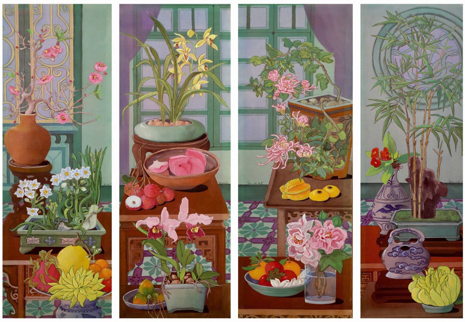 Vũ Thùy Mai (1990), tốt nghiệp Đại học Sư phạm Nghệ thuật Trung ương và Thạc sĩ Văn hóa học tại Học viện Khoa học Xã hội, xây dựng thế giới tĩnh vật mang sắc thái hoài cổ. Hoa lá, trái cây, gốm sứ được đặt trong không gian nội thất cổ kính với bảng màu xanh lục, vàng điệp, tím – xanh phớt nhẹ, tạo cảm giác tĩnh tại và an nhiên.