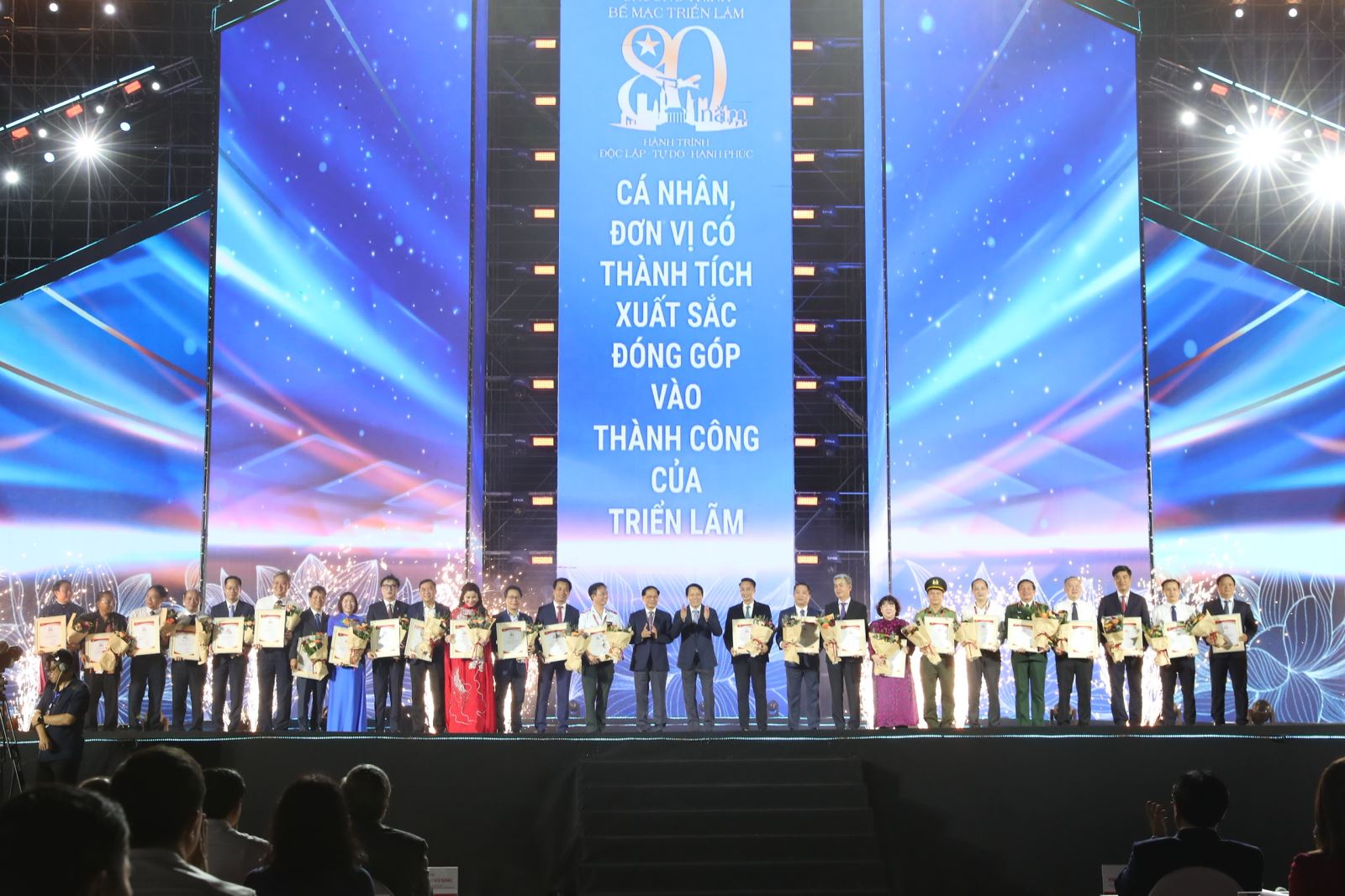 Thay mặt Lãnh đạo Đảng, Nhà nước, Thủ tướng ghi nhận, đánh giá cao và trân trọng cảm ơn sự tâm huyết, trách nhiệm, sự nỗ lực, sức sáng tạo của các bộ, ban, ngành, địa phương, doanh nghiệp, các nhà khoa học, nghệ nhân, nghệ sĩ, nhạc sĩ, nhà sản xuất âm nhạc, đơn vị tổ chức nghệ thuật, các tình nguyện viên cùng toàn thể đồng chí, đồng bào đã chung tay làm nên thành công rực rỡ của Triển lãm, tỏa sáng tinh thần “Đoàn kết - Trí tuệ - Sức mạnh - Vinh quang - Tự hào chúng ta là người Việt Nam”.