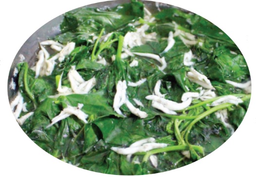 Nước vừa sôi, thả cá vào, chỉ vài phút sau cá đã trắng ngần, thơm tiếp theo là công đoạn cho rau lang vào, nêm nếm vừa miệng. Khi canh vừa chín tới, nhanh tay múc ra bát, rắc thêm hành lá, rau răm, ngò rí thái nhỏ. Bát canh nóng hổi, màu trắng trong của cá mờm nổi bật trên nền xanh rau lang, những sợi cá cong cong như chữ J, chữ I, chữ C, trông thật ngộ nghĩnh và bắt mắt.