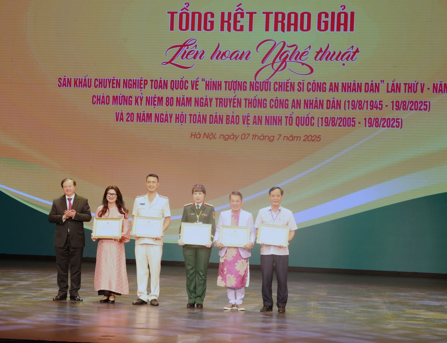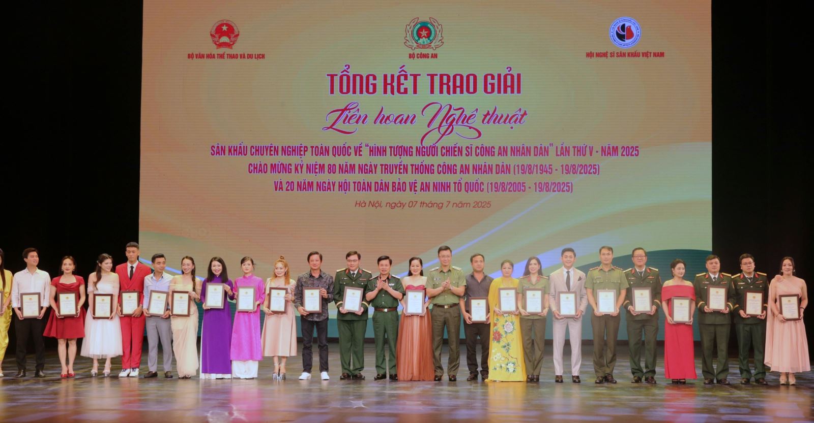 Tối 7-7, tại Nhà hát Hồ Gươm, đã diễn ra lễ Tổng kết trao giải Liên hoan nghệ thuật sân khấu chuyên nghiệp toàn quốc về “Hình tượng người chiến sĩ Công an nhân dân” lần thứ V, năm 2025. Liên hoan do Bộ Công an phối hợp với Bộ VHTTDL, Hội Nghệ sĩ Sân khấu Việt Nam tổ chức, hướng đến chào mừng kỷ niệm 80 năm Ngày truyền thống CAND và 20 năm Ngày hội toàn dân bảo vệ an ninh Tổ quốc.