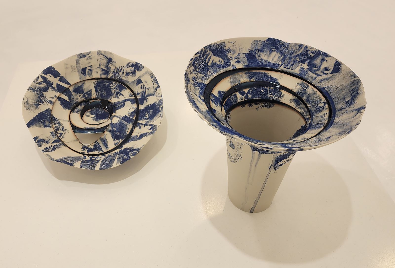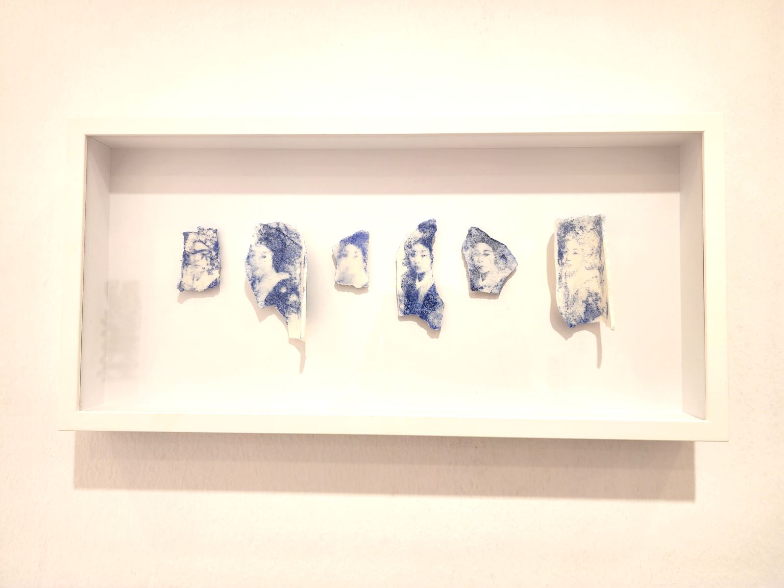 Tác phẩm đất sét sứ, men, in chuyển dưới men Xanh chồng xanh. Gương mặt của nghệ sĩ gốm và nhiếp ảnh gia được thay thế trong cùng một bức chân dung lưu trữ. Từ một bức ảnh gốc duy nhất, hai tấm chân dung hư cấu gần như giống hệt nhau đã được tạo ra, sự chuyển dịch của họ chồng lớp và khắc vào bề mặt sứ. Hai dáng hình tưởng tượng chưa từng tồn tại vọng vào nhau, lặng lẽ tiếp tục đời sống nơi đất.