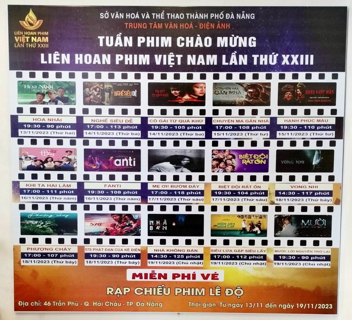 Theo đó, một trong những sự kiện chào mừng, nằm trong khuôn khổ của LHP là Tuần phim Việt Nam sẽ được đồng thời tổ chức tại Thủ đô Hà Nội và thành phố Đà Nẵng. Tuần phim sẽ giới thiệu đến công chúng 28 bộ phim điện ảnh đa dạng về thể loại, đề tài, hình thức thể hiện, phản ánh góc nhìn đa chiều về cuộc sống của các nhà làm phim, hướng tới xây dựng nền công nghiệp điện ảnh Việt Nam giàu bản sắc dân tộc, hiện đại và nhân văn được chọn chiếu miễn phí kể từ ngày 13 đến 19-11-2023. Gồm các phim: 578; 9; Cô gái từ quá khứ; Con Nhót mót chồng; Đào, Phở và Piano; Em và Trịnh; Fanti; Hoa Nhài; Hồng Hà nữ sĩ; Kẻ ẩn danh; Mẹ ơi, Bướm đây; Mười: Lời nguyền trở lại; Nhà bà Nữ; Tro tàn rực rỡ; Biệt đội rất ổn; Chạm vào hạnh phúc; Chuyện ma gần nhà; Giao lộ 8675; Hạnh phúc máu; Khi ta hai lăm; Memento Mori: Đất; Nghề siêu dễ; Nhà không bán; Phơi sáng; Phượng cháy; Siêu lừa gặp siêu lầy; Tiểu đội hoa hồng; Vong Nhi.