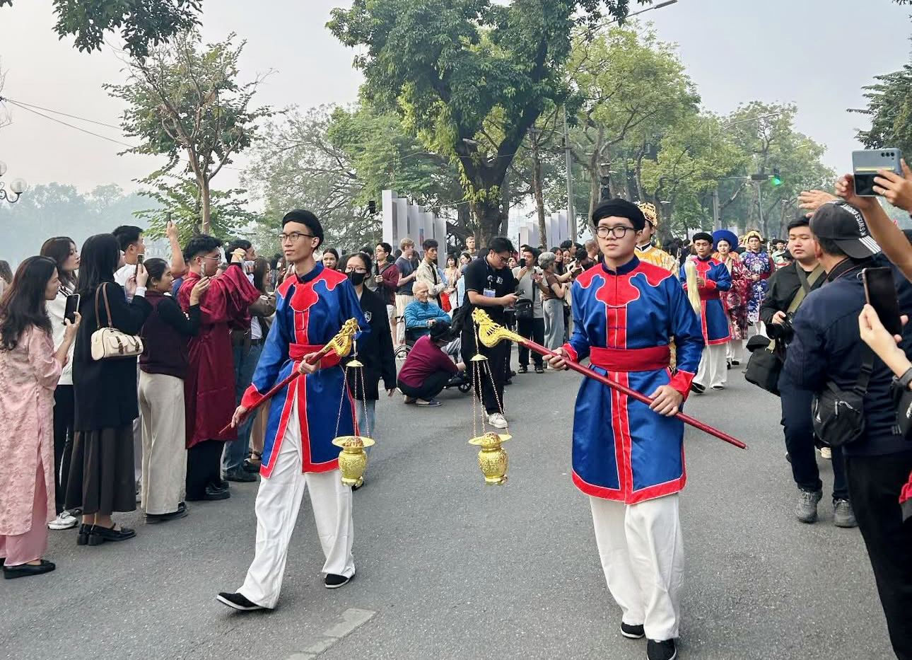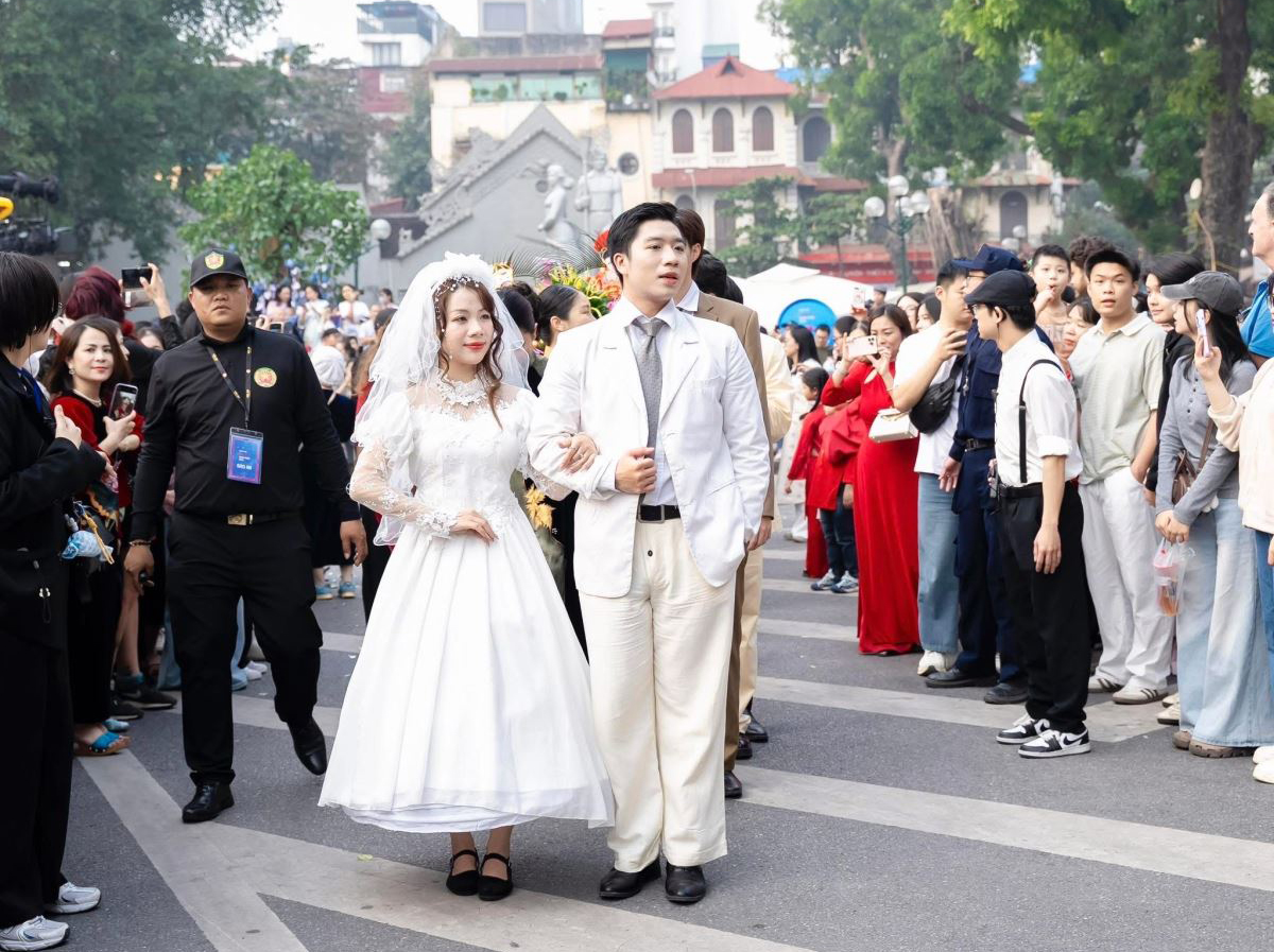 Đoàn rước xuất phát từ Quảng trường Đông Kinh Nghĩa Thục trước khi di chuyển qua phố Hàng Dầu, ngã tư Tràng Tiền - Hàng Khay và vòng quanh hồ Hoàn Kiếm. Lộ trình vốn quen thuộc với người dân Thủ đô bỗng trở thành sân khấu mở khi hàng trăm bước chân nhịp nhàng tiến qua những tuyến phố trung tâm. Dọc đường, người xem liên tục dừng lại ghi hình, trầm trồ trước những bộ lễ phục được phục dựng dựa trên tư liệu triều Nguyễn, từ áo đại triều, hoàng phục đến khăn vấn, hia cưới hay các loại lễ phẩm mang ý nghĩa cát tường. Giữa không gian thoáng đãng của phố đi bộ, đoàn quan viên, gia tộc và hình ảnh tân lang – tân nương bước đi trang trọng tạo cảm giác vừa thiêng liêng vừa gần gũi, như kéo quá khứ trở về trong khoảnh khắc rất đời thường của Hà Nội hôm nay.