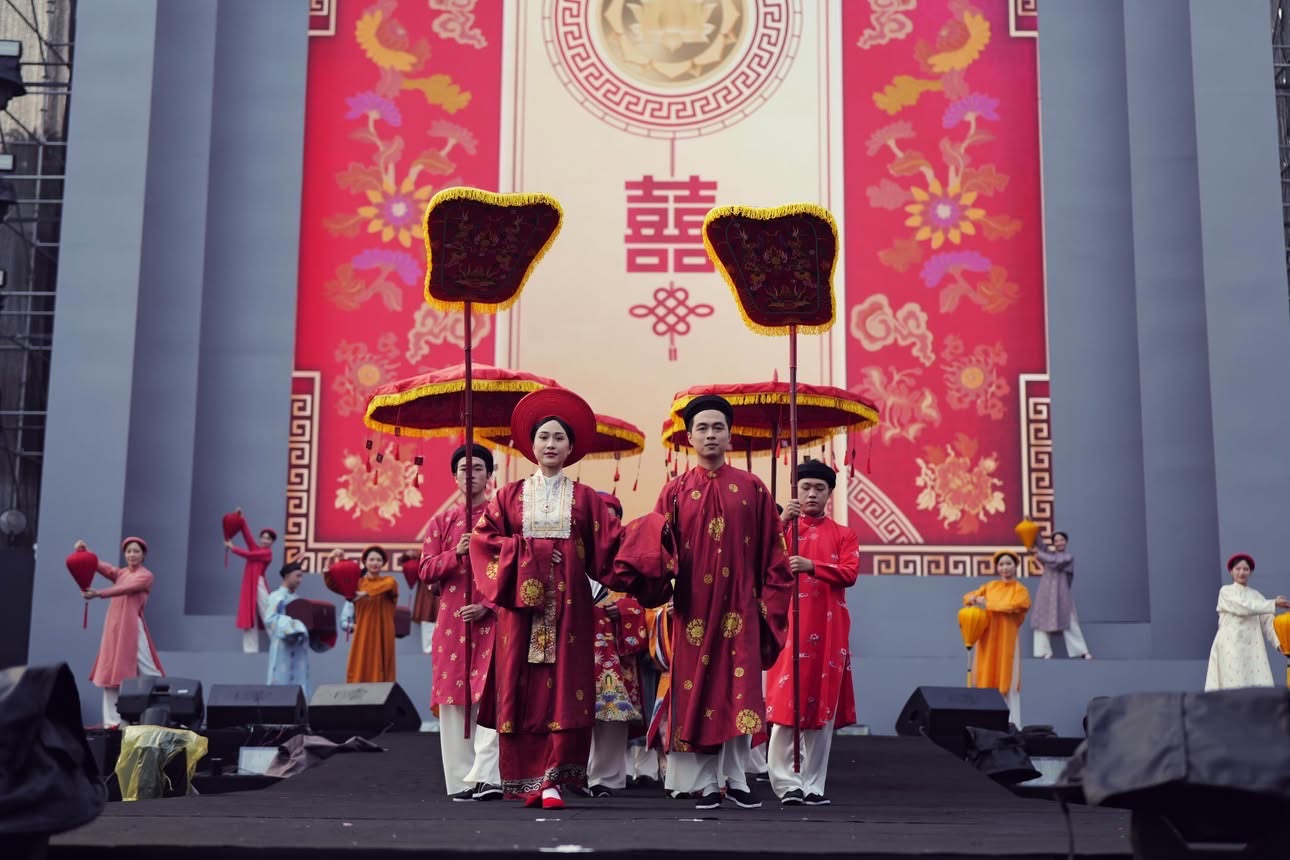 Màn tái hiện lễ rước dâu truyền thống với đoàn rước di chuyển từ Quảng trường Đông Kinh Nghĩa Thục