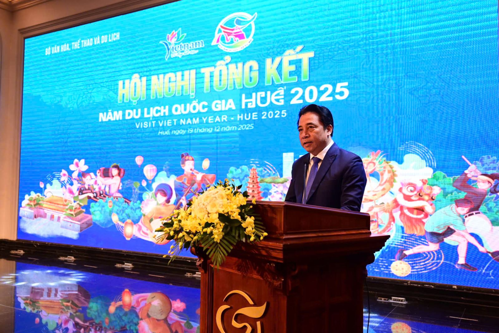 Phát biểu tại Hội nghị, Bộ trưởng Bộ VHTTDL Nguyễn Văn Hùng nhấn mạnh: Hội nghị được diễn ra trong những ngày cuối năm, khi nhiều hoạt động phong phú đang diễn ra trên khắp cả nước. Đây cũng là thời điểm Chính phủ đang tổ chức khởi công những công trình trọng điểm của quốc gia để chào mừng Đại hội Thi đua yêu nước và hướng tới Đại hội Đảng toàn quốc lần thứ XIV. Sự hiện diện đông đủ của các địa phương, các bộ ngành và hiệp hội du lịch tại sự kiện đã minh chứng cho sự quan tâm sâu sắc đối với ngành kinh tế tổng hợp của đất nước. “Chúng ta sẽ cùng nhau nhìn nhận lại quá trình phát triển 5 năm qua và đặc biệt là Năm Du lịch quốc gia 2025 tại Huế để có thêm những bài học quý giá, những kinh nghiệm trong điều hành và phát triển du lịch tại các địa phương, qua đó đóng góp vào sự tăng trưởng chung của đất nước, nhất là trong năm đầu tiên 2026 thực hiện Nghị quyết Đại hội Đảng toàn quốc lần thứ XIV” – Bộ trưởng nêu rõ.