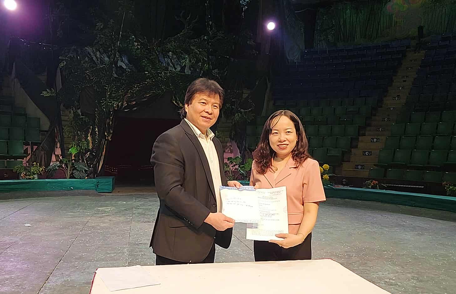 NSND Tống Toàn Thắng - Giám đốc Liên đoàn Xiếc Việt Nam trao trực tiếp số tiền quyên góp sau đêm diễn cho bà Nguyễn Hiền Phương - Chủ tịch Ủy ban Mặt trận Tổ quốc phường Hai Bà Trưng, TP.Hà Nội