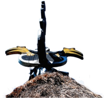 Trên lưng chim Triêng, hình đầu trâu với cặp sừng cong vút hiện ra đầy uy nghi. Con trâu vốn là tài sản quý, là vật hiến tế trong những lễ hội lớn, mang đến sự sung túc, may mắn. Bên trên nữa, hình một chàng trai khỏe mạnh, hai tay giơ cao chống đỡ, nâng đỡ cả mái nhà, trên đầu lại có hai con hổ oai phong. Tất cả tạo nên một bản hòa ca bằng hình khối: chim – trâu – người – hổ, gói ghém khát vọng ấm no, sức mạnh và sự trường tồn.