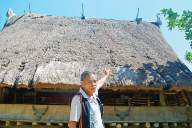 Già Tơngôl Aping, trú tại thôn Pà Ting, xã Bến Giằng, TP Đà Nẵng giới thiệu chim thiêng trên nóc nhà Gươl