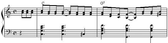 Giai điệu chính ở điệu thức Bb trưởng, bè tay phải thêm vào cùng âm hình với giai điệu dưới dạng chồng âm, tay trái diễn tấu âm hình kép.