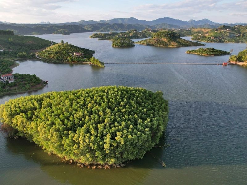 Có nhiều hòn đảo lớn nhỏ nổi lên mặt nước với rừng cây xanh ngắt tạo nên cảnh quan quyến rũ