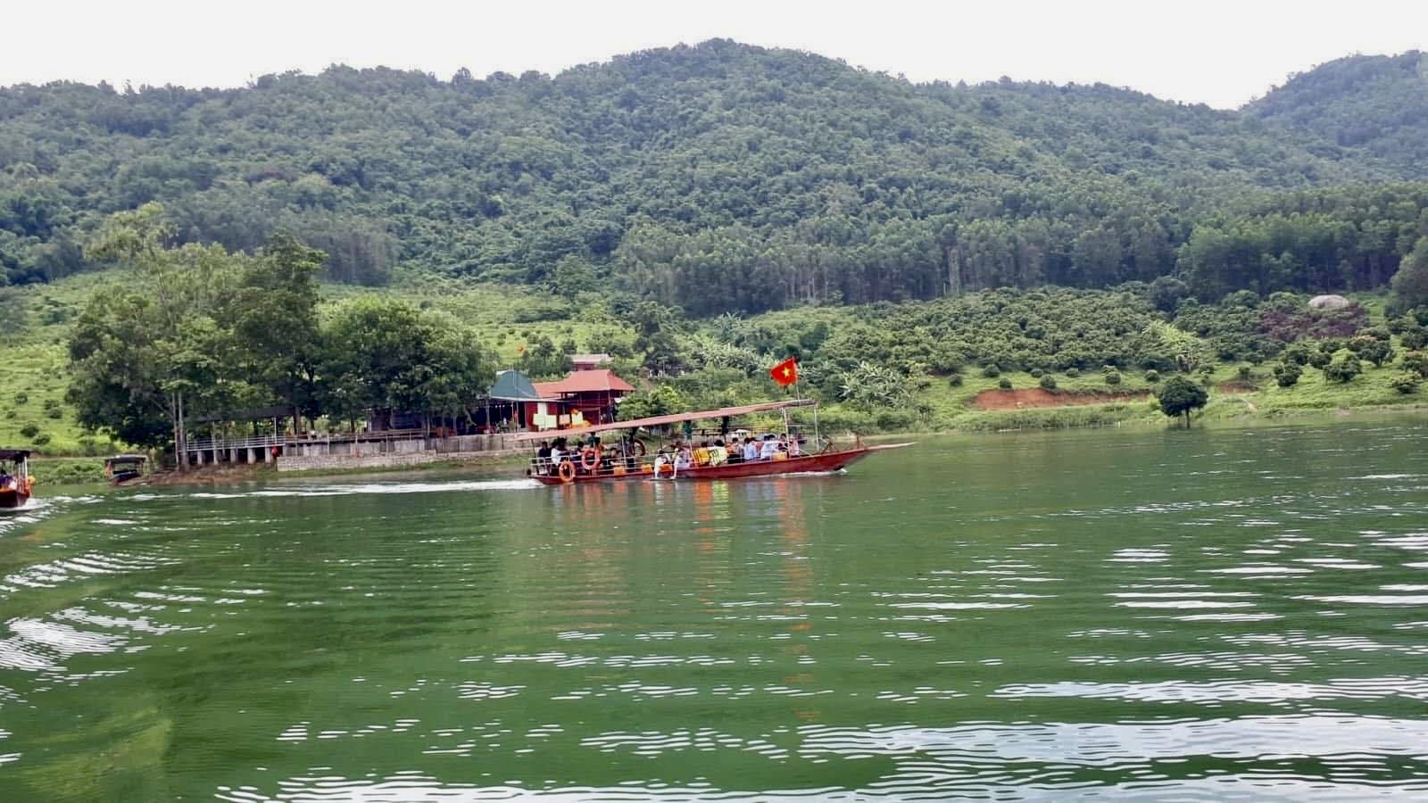 Du khách đi thuyền ngắm cảnh lòng hồ