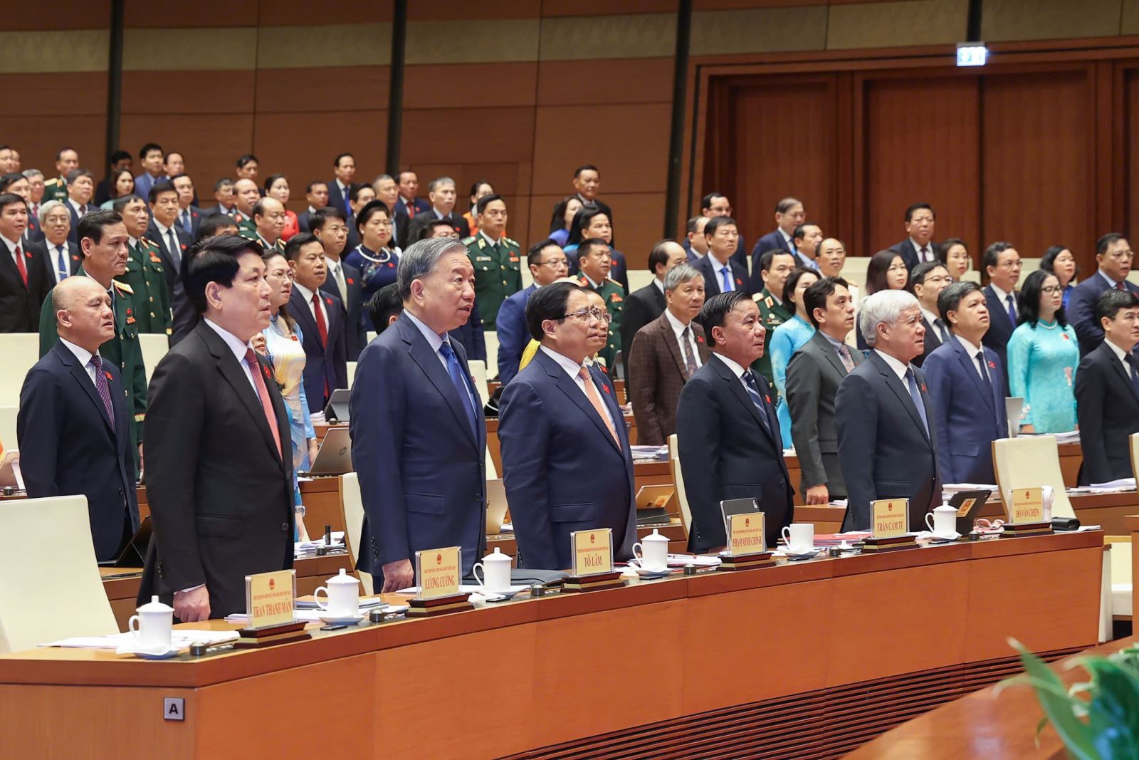 Tổng Bí thư Tô Lâm và các đồng chí lãnh đạo Đảng, Nhà nước, các đại biểu Quốc hội thực hiện nghi thức chào cờ tại Phiên khai mạc Kỳ họp thứ 10, Quốc hội khóa XV