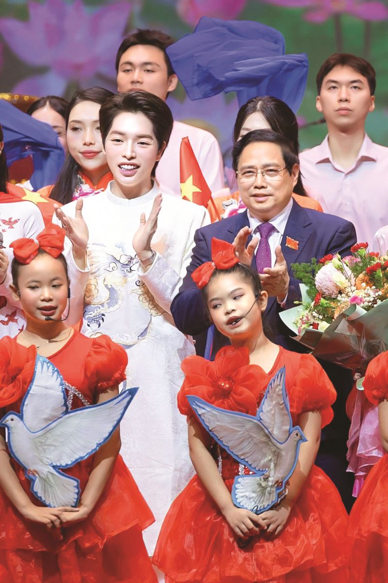 Thủ tướng Phạm Minh Chính chụp ảnh với các nghệ sĩ (trong đó có Đức Phúc) trong phiên trù bị Đại hội đại biểu Đảng bộ Chính phủ lần thứ I