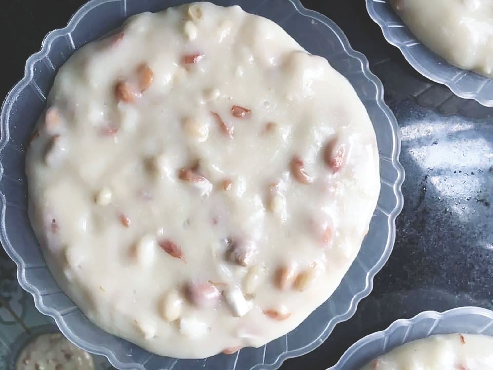 Gạo tẻ xưa kia được xay thủ công bằng cối đá quay tay, ngày nay có máy xay nên tiện hơn. Sau khi bột gạo được xay xong, đổ vào ngâm với nước vôi trong và thêm một chút muối hoặc bột canh. Hạt lạc được ngâm chừng 5-6 tiếng cho nở đều rồi luộc chín, vớt ra rổ để ráo nước. Tùy sở thích có thể để nguyên hoặc tách bỏ vỏ lụa bên ngoài hạt lạc.