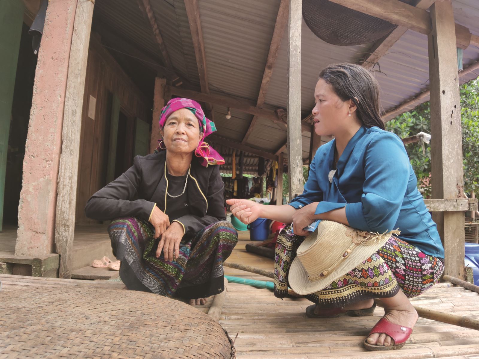 Chị Y Quyết, Phó Bí thư Đảng ủy, Chủ tịch HĐND xã Thượng Trạch thăm hỏi người cao tuổi ở trong bản