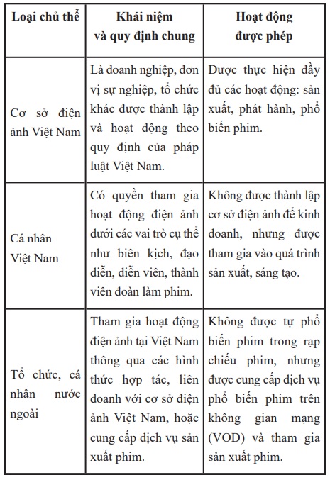 Pháp luật điện ảnh Việt Nam quy định về các tổ chức, cá nhân tham gia vào ba khâu chính (sản xuất, phát hành, phổ biến) với sự phân biệt rõ ràng giữa chủ thể trong nước và nước ngoài: