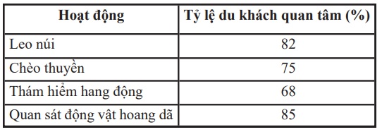 Trong đó, quan sát động vật hoang dã có tỷ lệ quan tâm cao nhất (85%), phản ánh xu hướng du lịch sinh thái kết hợp khám phá tự nhiên đang phát triển mạnh. Leo núi và chèo thuyền cũng thu hút lượng lớn du khách, đặc biệt là nhóm khách du lịch trẻ, yêu thích thử thách và hoạt động thể chất.