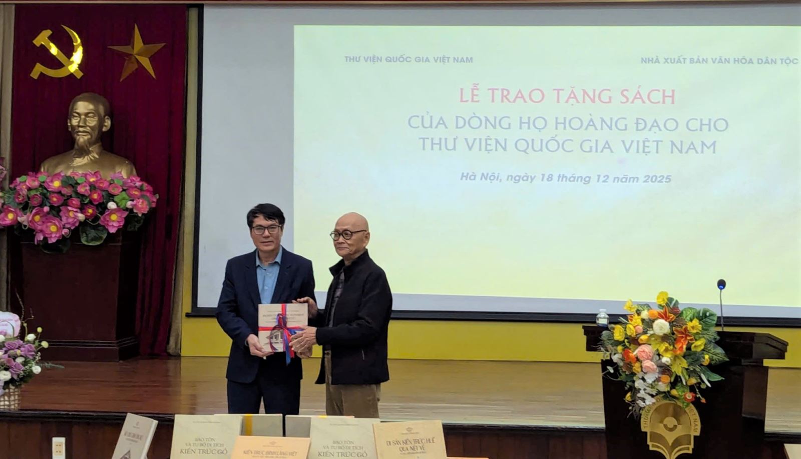 Chiều ngày 18-12-2025 tại Hà Nội, Thư viện Quốc gia Việt Nam phối hợp với Nhà xuất bản Văn hóa dân tộc tổ chức Lễ ra mắt và trao tặng các cuốn sách "Việt sử tân ước toàn biên" của tác giả Hoàng Đạo Thành và "Bảo tồn và tu bổ di tích kiến trúc gỗ" của tác giả Hoàng Đạo Cương - Thứ trưởng Bộ VHTTDL.