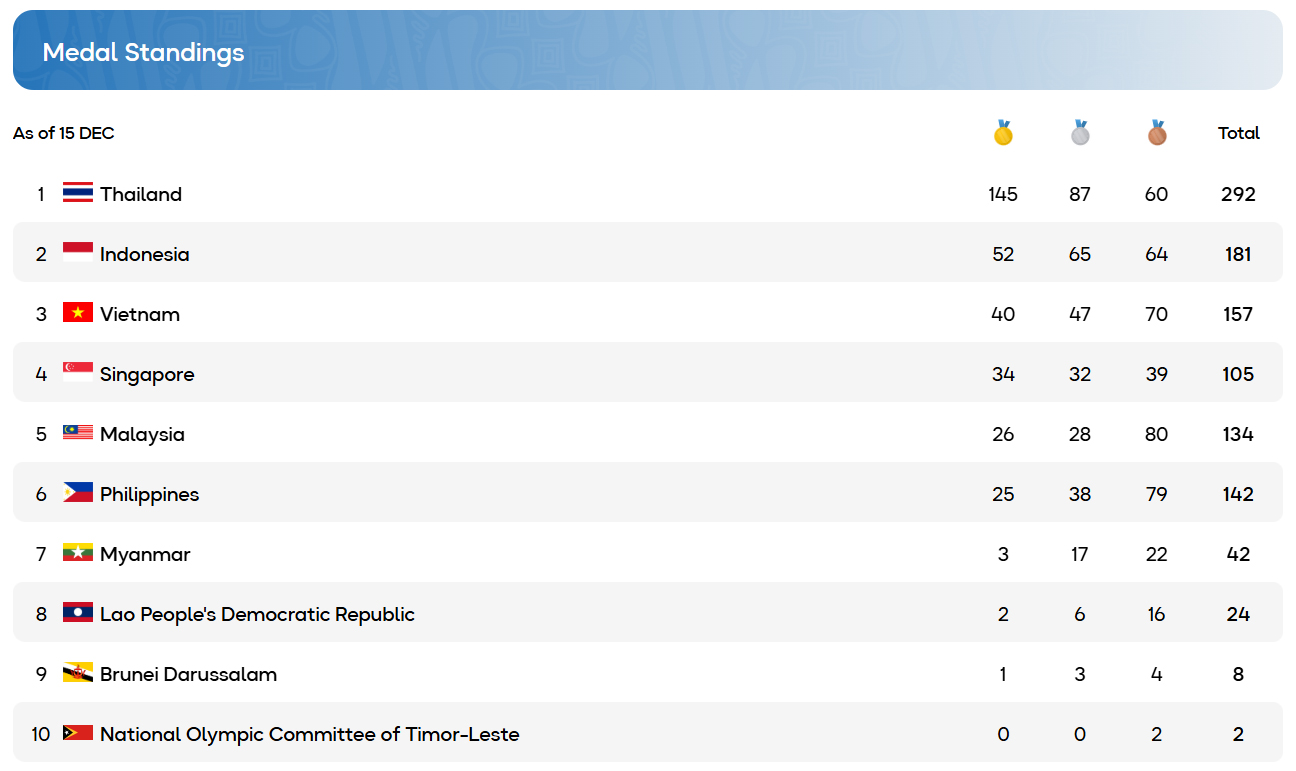 Ngày 15-12, ngày thi đấu chính thức thứ 6 tại SEA Games 33, Đoàn thể thao Việt Nam tiếp tục mang về thêm 5 HCV xếp vị trí thứ 3 trên bảng tổng sắp huy chương với 40 HCV, 47 HCB, 70 HCĐ, xếp sau đoàn Indonesia và Thái Lan.