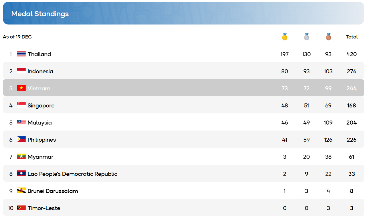 Ngày 18-12, ngày thi đấu chính thức thứ 9 tại SEA Games 33, Đoàn thể thao Việt Nam xuất sắc giành thêm 9 HCV trong đó vui nhất là tấm HCV mà đội tuyển U22 giành được, giữ vững vị trí thứ 3 trên bảng tổng sắp huy chương với 73 HCV, 72 HCB, 99 HCĐ.
