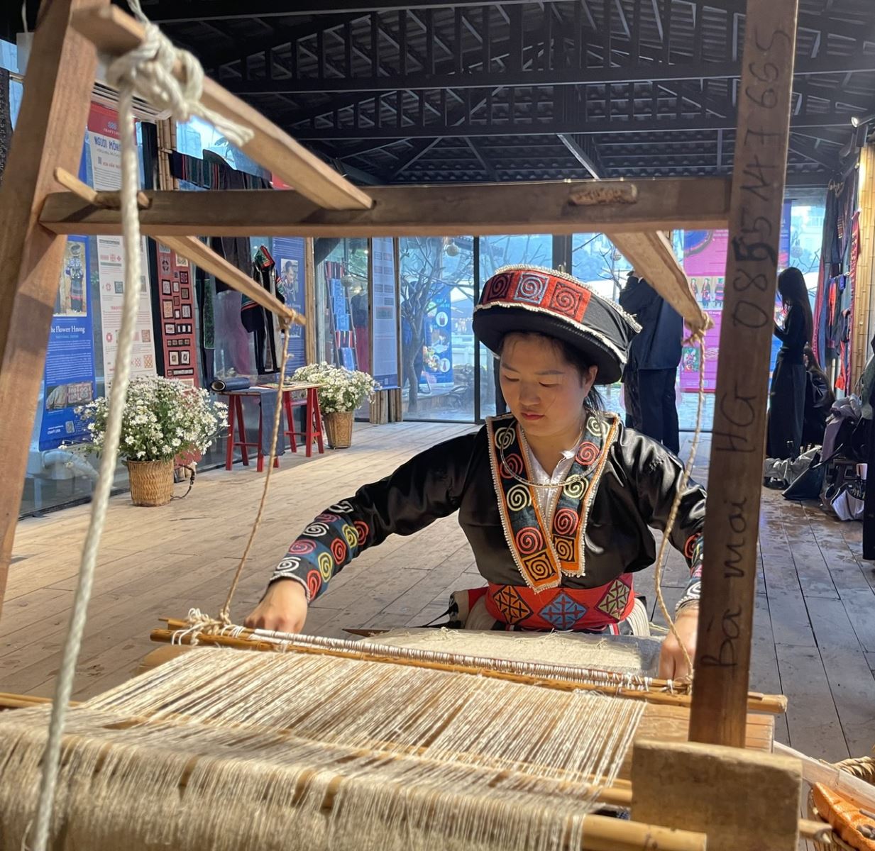 Chị Sùng Thị Dính, người Mông Xanh đến từ xã Lùng Tám (Tuyên Quang) bên khung cửi dệt lanh